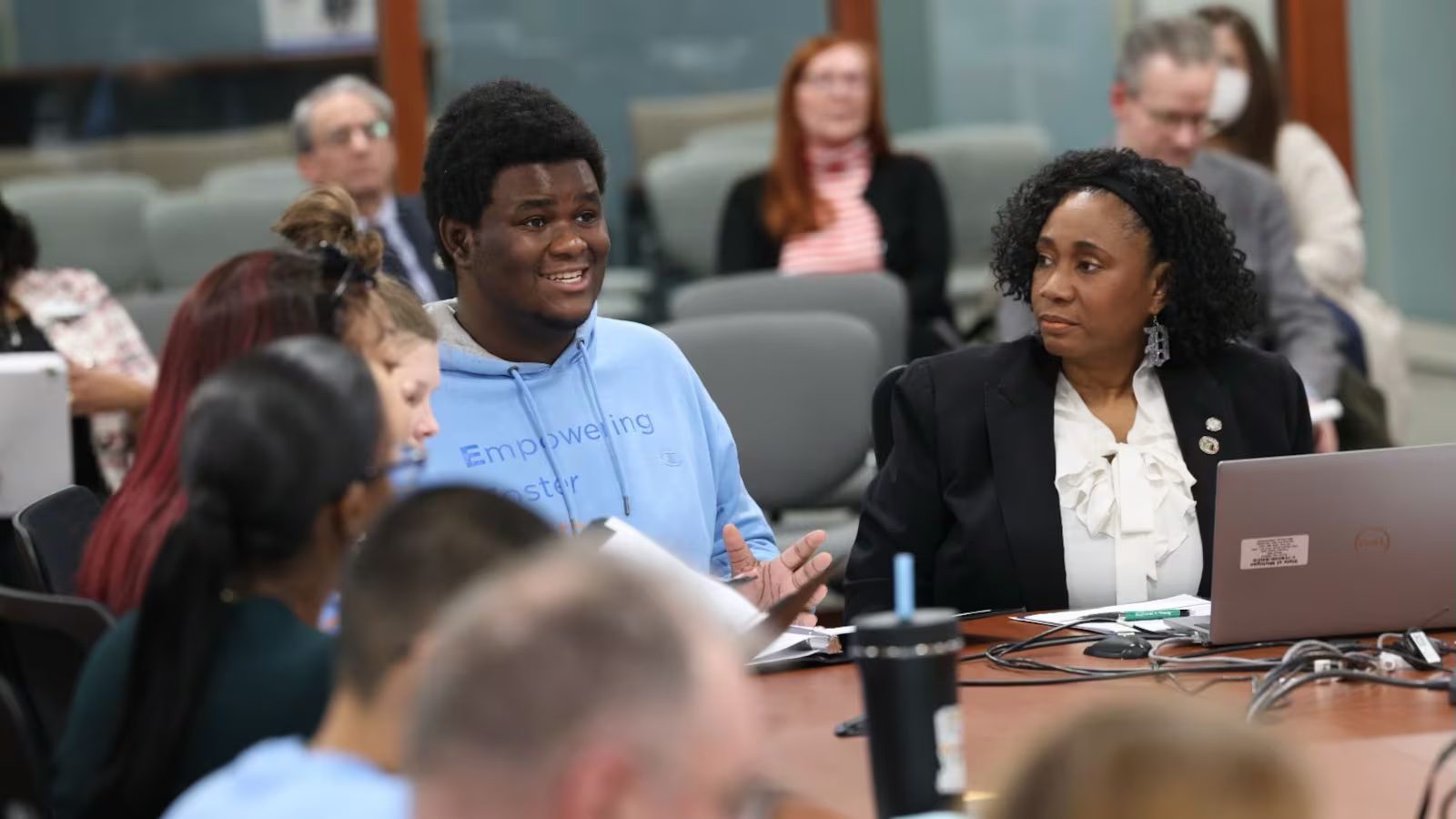 Christian Randle (center) speaks to the Michigan State Board of Education on Dec. 12 about bills proposed by Rep. Stephanie Young (right) that would reform oversight of education for youth in foster care in the state. (Image courtesy of Park West)