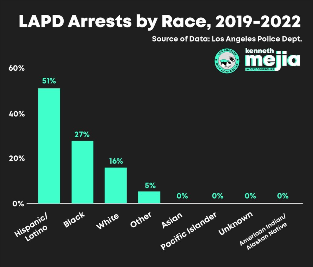 City Controller Kenneth Mejia’s office released an analysis Wednesday night of the LAPD’s nearly 300,000 arrests made from 2019 to 2022. Mejia was elected in November, and part of his campaign involved putting up billboards around Los Angeles blasting the city’s massive police budget.
