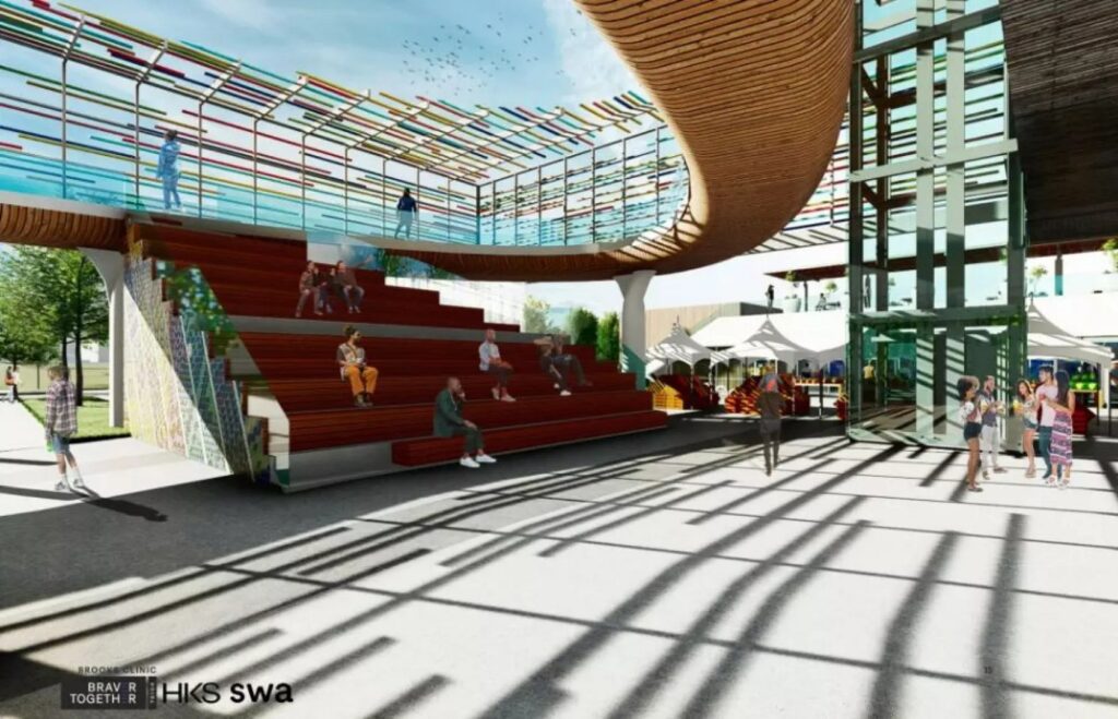 Just outside the Brooks Clinic entrance would be a community amphitheater. Above it is an elevated circular track where residents could walk or exercise. “The track was really the main driver of how we started to architecturally come up with the concept,” said Justin Roark, senior designer with HKS.