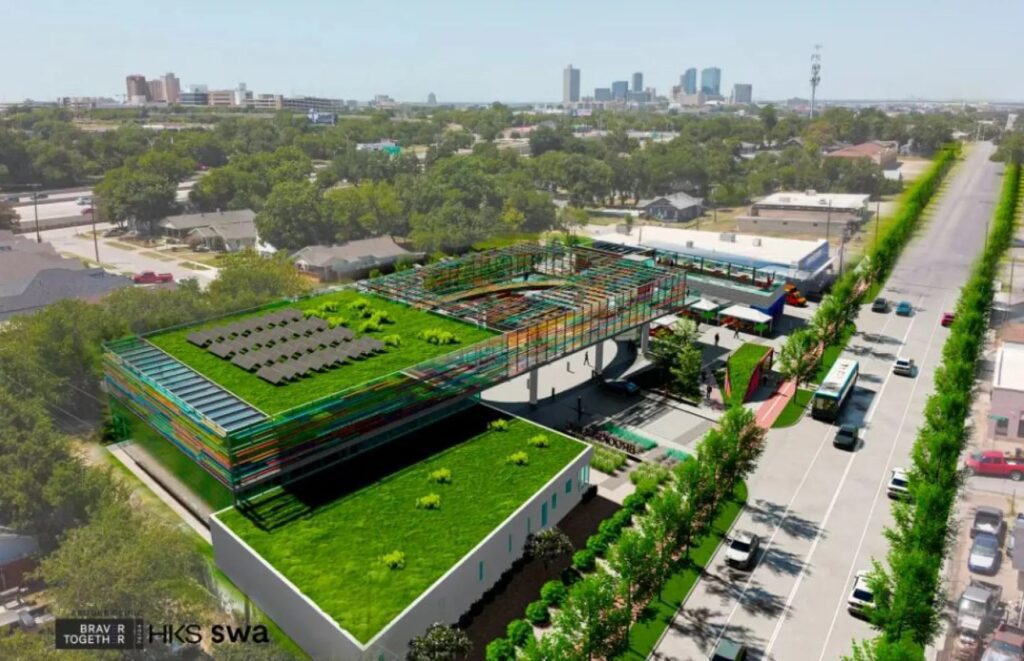 An overview rendering of the Brooks Clinic with the Fort Worth skyline in the distance. The project would be divided into two parts: health zone and community zone. “At the end of the day, there was an opportunity to bridge them together physically in a really safe and elevating fashion,” said Justin Roark, senior designer with HKS.