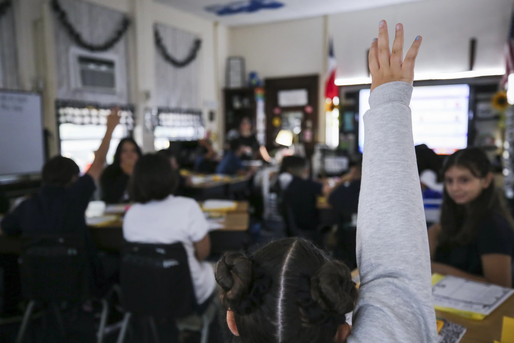 A student raises their hand in class Monday, Aug. 14, 2023, Rufino Mendoza Elementary School in Fort Worth.