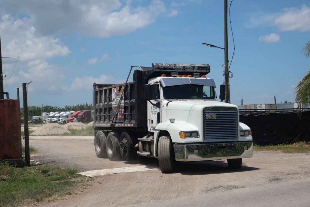 Wanek worries that roads in the Redland area were not built to withstand traffic from heavy trucks, and the sheer amount of trucks is causing potholes. Driving through the zone, WLRN and Wanek spotted an 18-wheeler catch a flat tire on a pothole-ridden gravel road, after the tire was seen grinding against the truck bed.