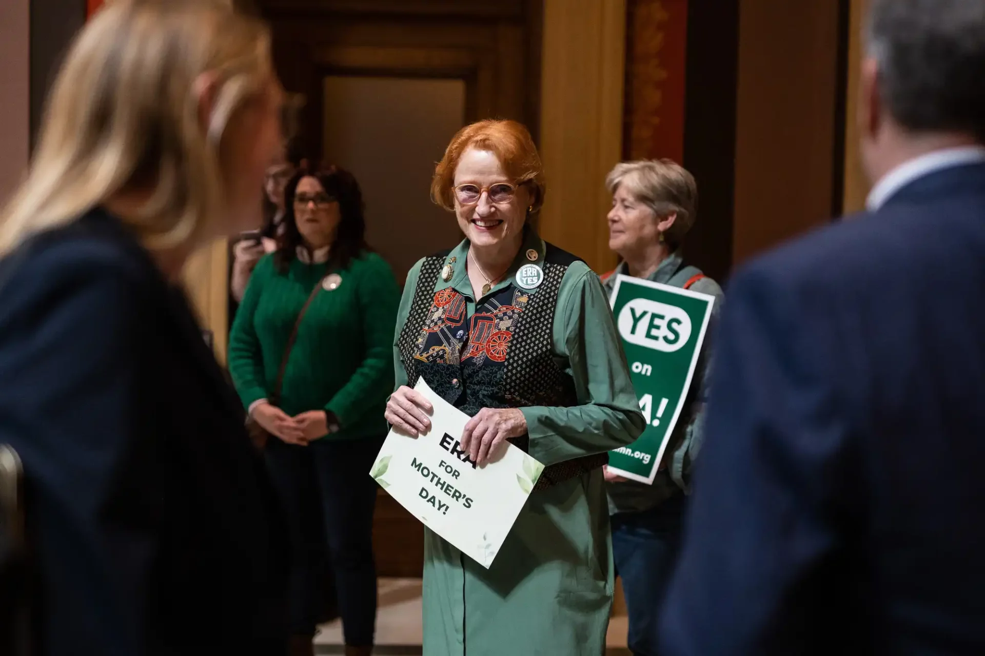 She and her fellow ERA Minnesota volunteers stood near the Senate Chamber’s entrance carrying ERA signs. “Yes on ERA!” and “ERA for Mother’s Day.”