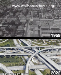 Aerial footage of Overtown, Miami before and after much of the neighborhood was bulldozed for the construction of I-95 in the ’60s. Over 12,000 residents of the neighborhood were displaced for the highway.(X@SegByDesign, WolfsonArchives.org)