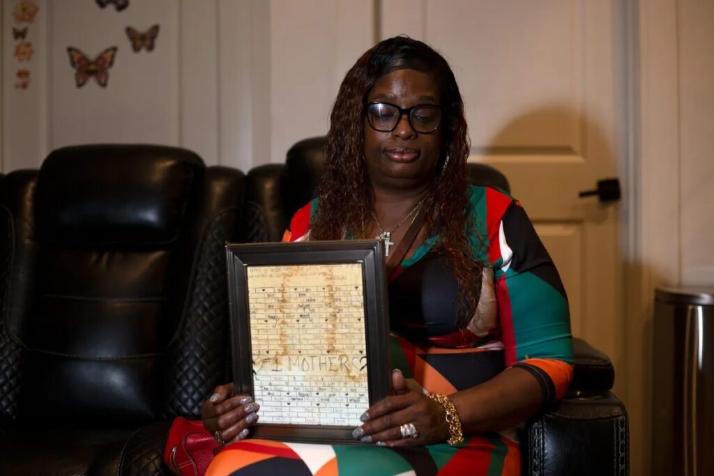Sharon McGriff holds a picture that reads “#1 Mother” her son made in 2009 while she was detained on Rikers Island. Nov. 6, 2023. Credit: Ben Fractenberg/THE CITY