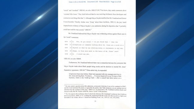 CBS Austin obtained the racial discrimination lawsuit mayor Snyder lost against former city manager Odis Jones. In its transcript Snyder is quoted calling black people “crooks” including Mr. Jones.
