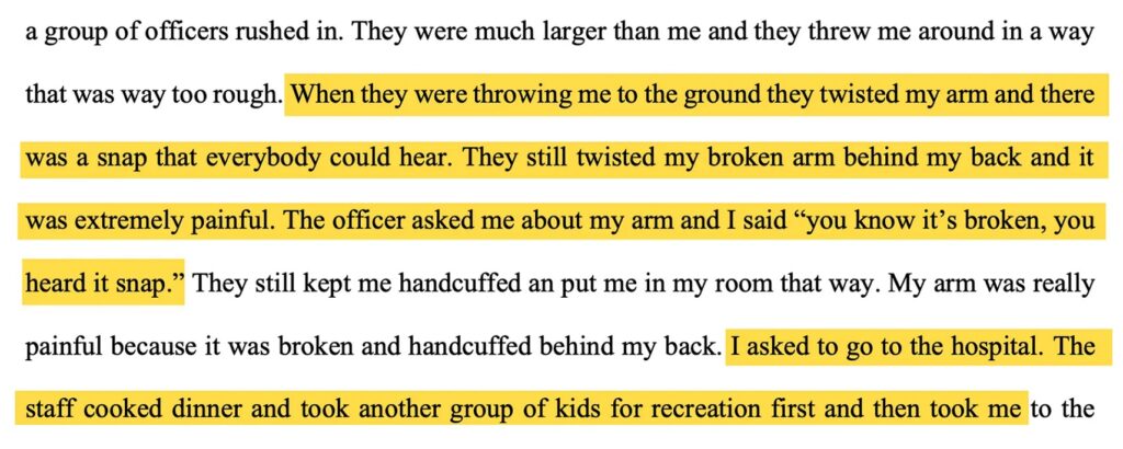 “The officer asked me about my arm and I said ‘You know it’s broken. You heard it snap,’” the youth who was injured, identified only by his initials, A.B., said in his signed statement. A.B. is not a plaintiff in the suit, though his statement was included as evidence of the poor conditions alleged by the ACLU. The ACLU is seeking class-action status for the case, and that request is pending before a federal judge.