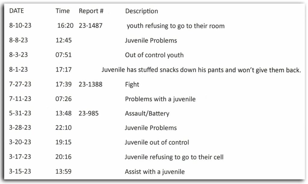 Law enforcement records obtained by Capitol News Illinois showed that staff called on sheriff’s deputies 21 times between September 2021 and August 2023. Some of the calls were for seemingly minor incidents. For instance, on Aug. 1, staff requested backup because a youth had “stuffed snacks down his pants and won’t give them back.”