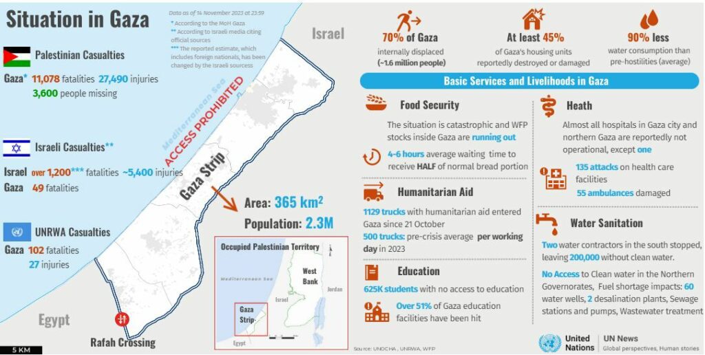 UN human rights office (OHCHR) spokesperson Liz Throssell highlighted concerns over Israeli airstrikes on Jabalia and Al Bureij refugee camps in recent days with dozens of residential buildings destroyed, as well as the high number of casualties reported in the enclave and the “reported use of explosive weapons with wide area effects in some of the most densely populated areas in Gaza”.