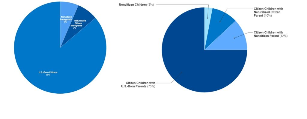 Based on federal survey data, as of 2021, there were 44.7 million immigrants residing in the U.S., including 20.8 million noncitizens and 23.9 million naturalized citizens, who accounted for about 6% and 7% of the total population, respectively (Figure 1).4 About six in ten noncitizens were lawfully present immigrants, such as lawful permanent residents (green card holders) and those with a valid work or student visa, while the remaining four in ten were undocumented immigrants, who may include individuals who entered the country without authorization and individuals who entered the country lawfully and stayed after their visa or status expired.5 Many individuals live in mixed immigration status families that may include lawfully present immigrants, undocumented immigrants, and/or citizens. A total of 19 million or one in four children living in the U.S. had an immigrant parent as of 2021, and the majority of these children were citizens (Figure 1).6 About 9.1 million or 12% were citizen children with at least one noncitizen parent.