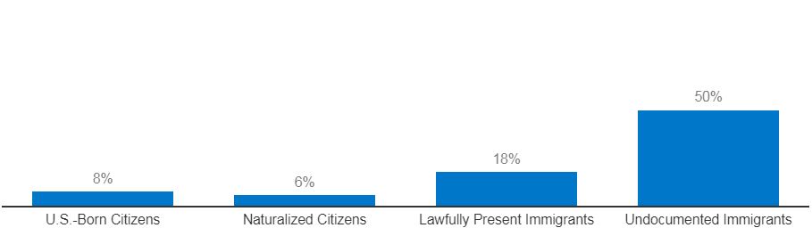 As of 2023, half (50%) of likely undocumented immigrant adults and one in five (18%) lawfully present immigrant adults report being uninsured compared to less than one in ten naturalized citizen (6%) and U.S.-born citizen (8%) adults.3 Noncitizen immigrants are more likely to be uninsured than citizens because they have more limited access to private coverage due to working in jobs that are less likely to provide health benefits and they face eligibility restrictions for federally funded coverage options, including Medicaid, the Children’s Health Insurance Program (CHIP), Affordable Care Act (ACA) Marketplace coverage, and Medicare. Those who are eligible for coverage also face a range of enrollment barriers including fear, confusion about eligibility rules, and language and literacy challenges. Reflecting their higher uninsured rate, noncitizen immigrants are more likely than citizens to report barriers to accessing health care and skipping or postponing care. Immigrants have lower health care expenditures than their U.S.-born counterparts given their more limited access and use.