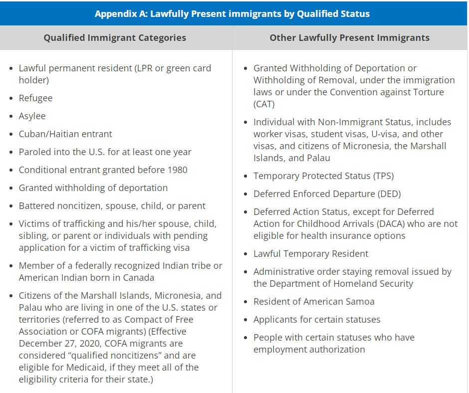 Lawfully present immigrants may qualify for Medicaid and CHIP but are subject to certain eligibility restrictions. In general, lawfully present immigrants must have a “qualified” immigration status to be eligible for Medicaid or CHIP, and many, including most lawful permanent residents or “green card” holders, must wait five years after obtaining qualified status before they may enroll. Some immigrants with qualified status, such as refugees and asylees, do not have to wait five years before enrolling. Some immigrants, such as those with temporary protected status, are lawfully present but do not have a qualified status and are not eligible to enroll in Medicaid or CHIP regardless of their length of time in the country (Appendix A). For children and pregnant people, states can eliminate the five-year wait and extend coverage to lawfully present immigrants without a qualified status. As of January 2023, 35 states have taken up this option for children and 26 states have elected the option for pregnant individuals.