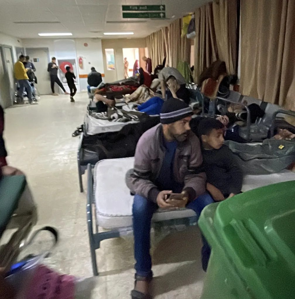 So now [at European Gaza Hospital] instead of 20,000 people, there’s about 35,000 people seeking shelter in a hospital that’s already beyond capacity. And so now, both outside and inside, there’s a mass of people. There’s no place to move now in the hallways. The sterility of the hospital has significantly decreased. The European Gaza Hospital, all you have to do is go online and look at their pictures before. It was a beautiful, gorgeous hospital. Well-built, well-run, good quality control — and now it’s reduced to a place that is a mess. It’s a mess. There’s people cooking inside the hospital hallways, there’s the bathrooms, there’s people mixed in with the people who are sick, with major orthopedic injuries, post op. There’s no beds. So sometimes people go and just sleep in their little makeshift shelters. And so infection is, if you can imagine, infection is rampant. So if you don’t die the first time or if your leg or arm is not amputated the first time, it is for sure with infection. So then they have to amputate it to save your life. So it’s much, much worse.