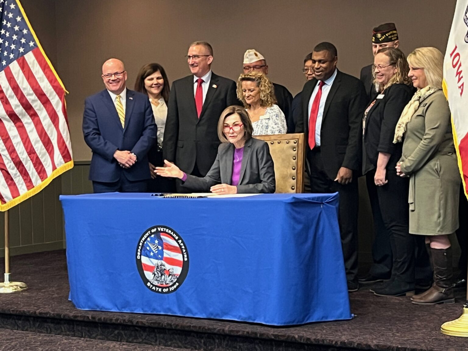 Gov. Kim Reynolds signed a bill Thursday that she said would help deliver services to military veterans and close a gap in eligibility for some Iowans with service-related disabilities.