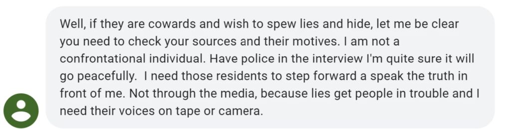 A text message from Town Park Village President Dana Milson to WLRN reporters.