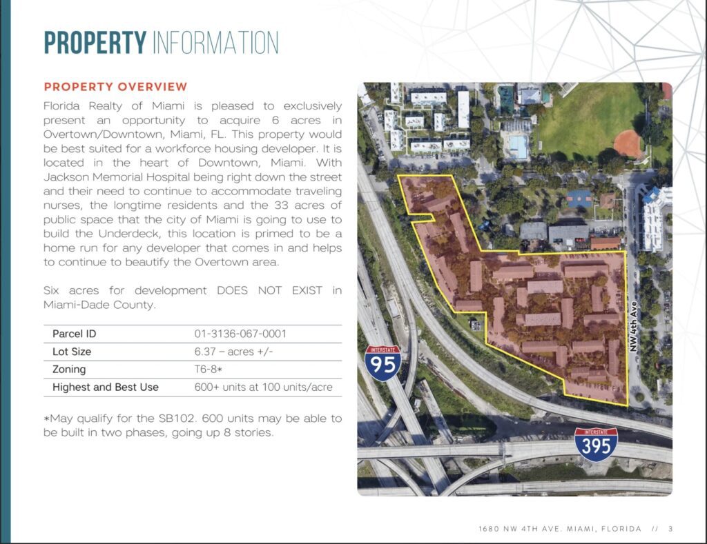 “This location is primed to be a home run for any developer that comes in and helps to continue to beautify the Overtown area. Six acres for development DOES NOT EXIST in Miami-Dade County,” the presentation states.