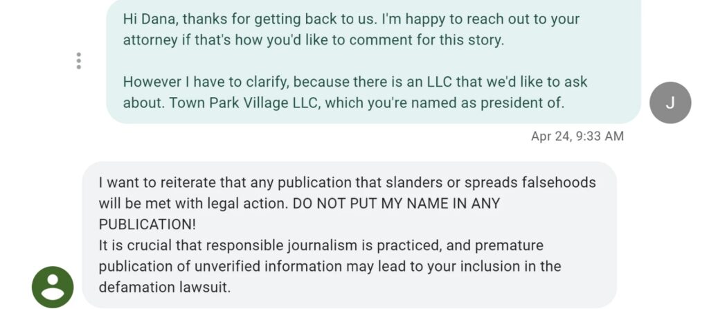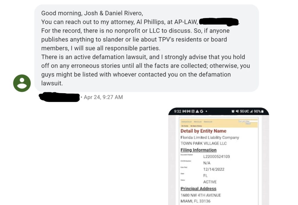 In a series of text messages, Milson wouldn’t answer questions about Town Park Village LLC. When WLRN showed her a screenshot of a corporate filing with herself listed as President, she responded with a threat of legal action.