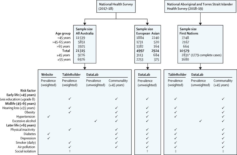 Figure 1Data sources and samples sizes, by age groups and population groups, for dementia risk factor prevalence estimates and communality estimates, from the ABS