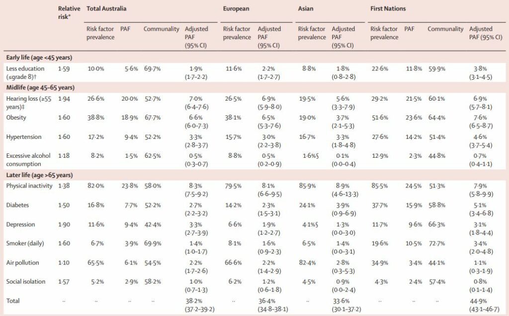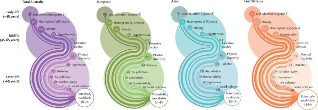 We found that 38·2% (95% CI 37·2–39·2) of dementia in the Australian population was attributable to 11 potentially modifiable risk factors, with variation across three population groups (First Nations Australians, Australians of Asian ancestry, and Australians of European ancestry). The overall PAF estimate for First Nations peoples (44·9%, 43·1–46·7) was higher than estimates for people of European (36·4%, 34·8–38·1) and Asian (33·6%,) 30·1–37·2) ancestry. Physical inactivity, obesity, and hearing loss contributed to around half of this risk for all Australians, and all population groups. Excess alcohol and social isolation had the lowest PAF estimates across all groups. Although there was some variation in individual risks between different population groups, most differences had overlapping CIs.