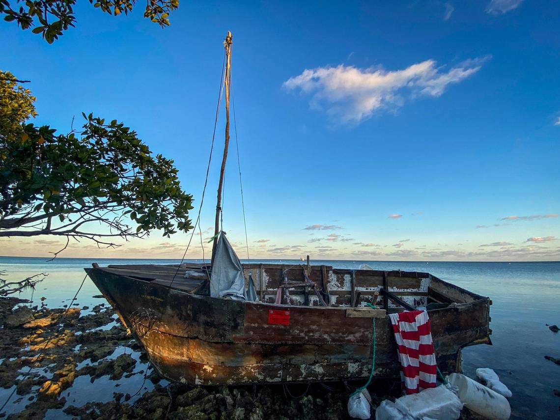A homemade boat used by Cuban migrants to reach the United States sits off shore at Harry Harris Park in Tavernier, in the Florida Keys, on Jan. 14, 2023. Jose A. Iglesias [email protected]