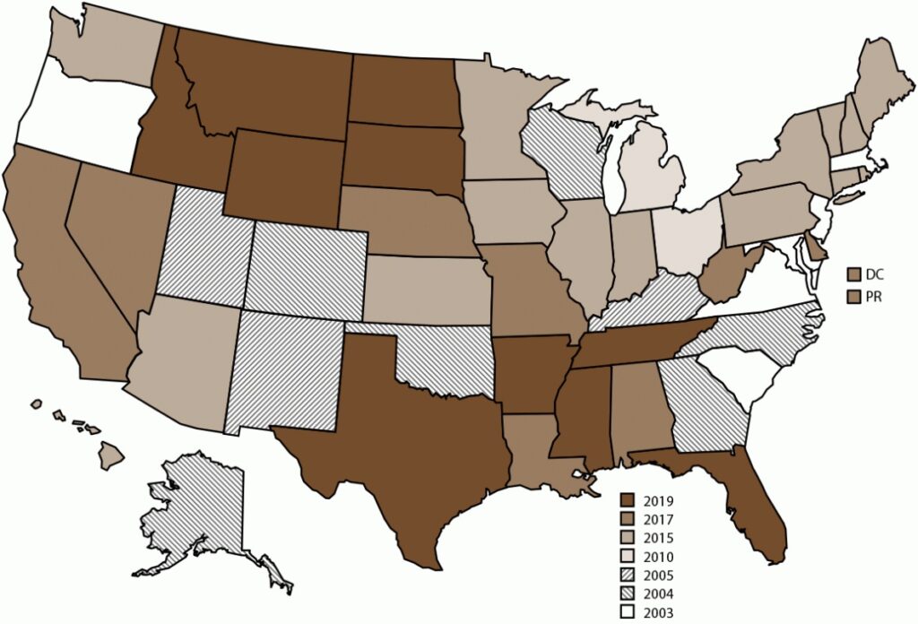 NVDRS data collection began in 2003 with six participating states (Maryland, Massachusetts, New Jersey, Oregon, South Carolina, and Virginia) and has expanded incrementally over time (Figure). Since 2018, CDC has provided NVDRS funding to all 50 states, the District of Columbia, and Puerto Rico. NVDRS data are updated annually and are available to the public through WISQARS* at https://www.cdc.gov/injury/wisqars/nvdrs.html. Case-level NVDRS data are available to interested researchers who meet eligibility requirements via the NVDRS Restricted Access Database (https://www.cdc.gov/violenceprevention/datasources/nvdrs/dataaccess.html).
