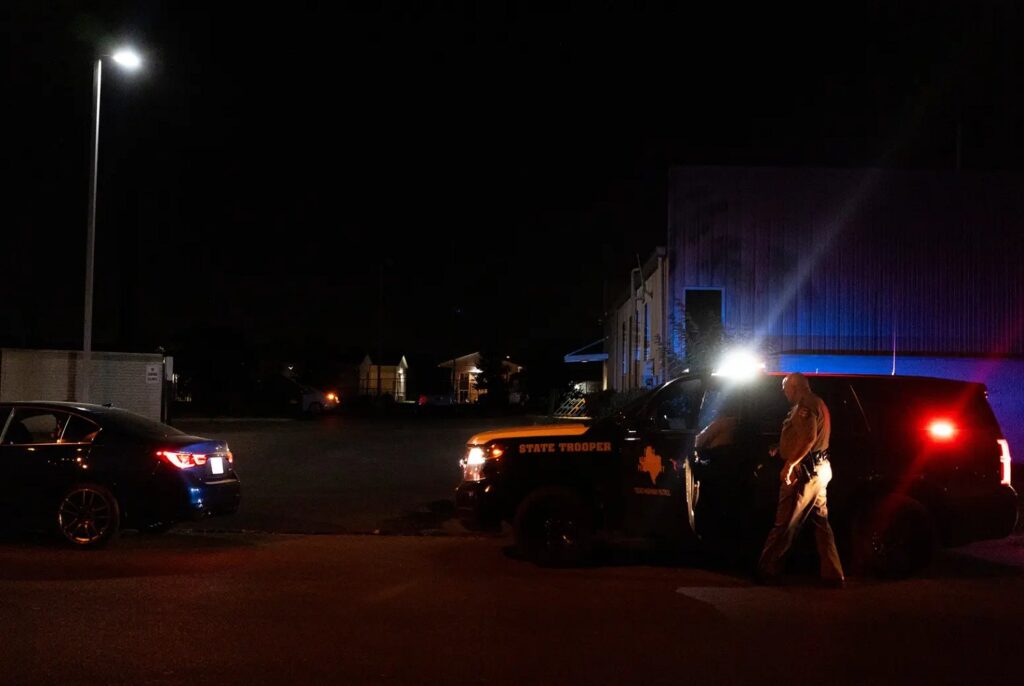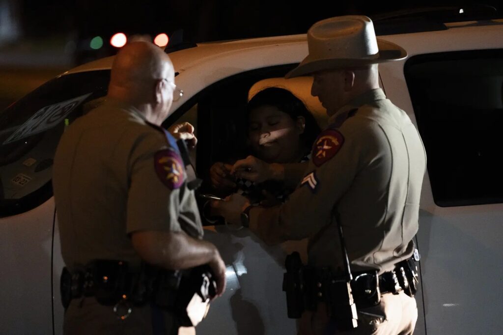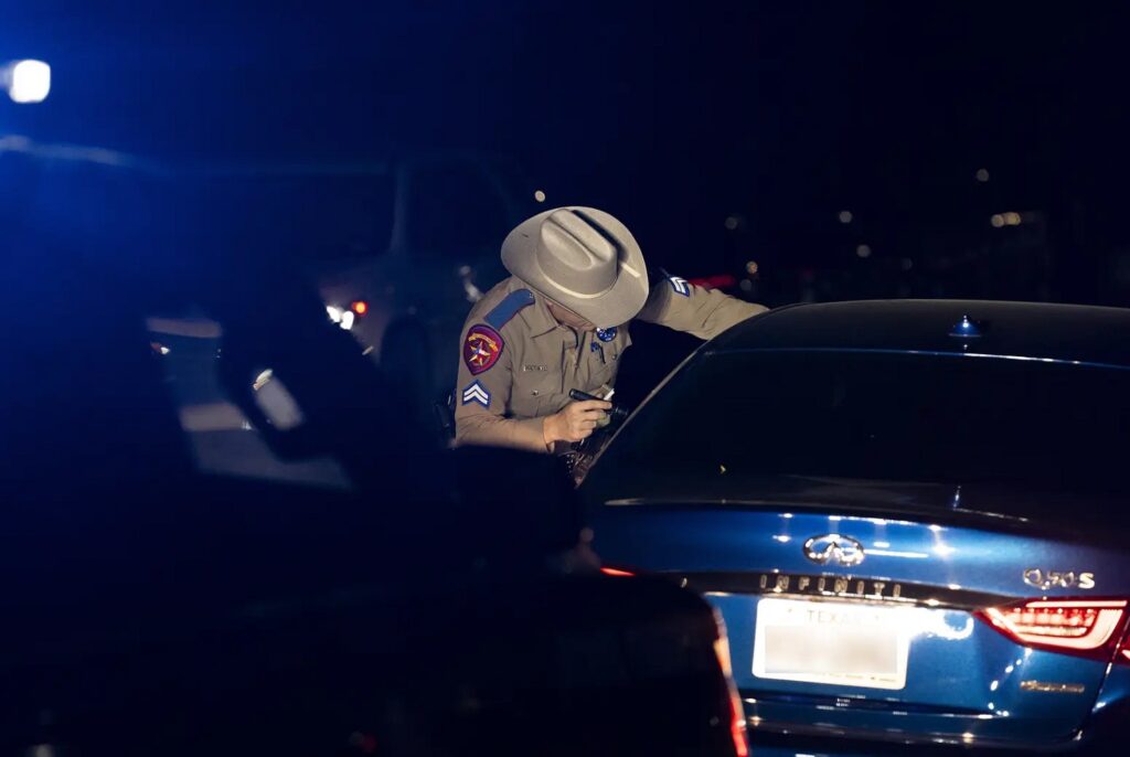 As the sun sets over Riverside Drive in Southeast Austin, a cluster of state troopers hits the streets — at one point, five Department of Public Safety SUVs sit at an intersection. They make one traffic stop after another, the gold Texas-shaped emblems on their doors reflecting their red and blue emergency lights.
