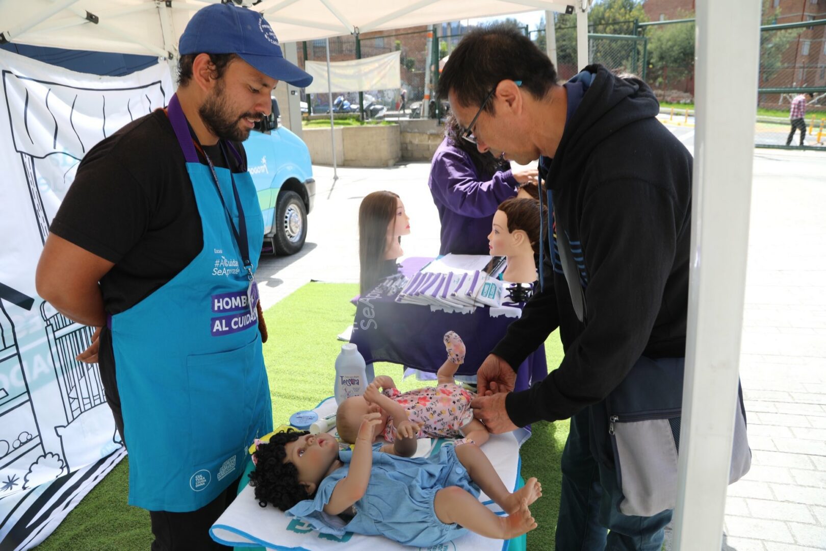 What has grabbed their attention is the sight of a dozen men huddled next to a van in the bright morning sun attempting, with varying degrees of success, to put diapers onto baby dolls. Most are middle-aged adults, but there are a few retirees and one teenager giving it a try.