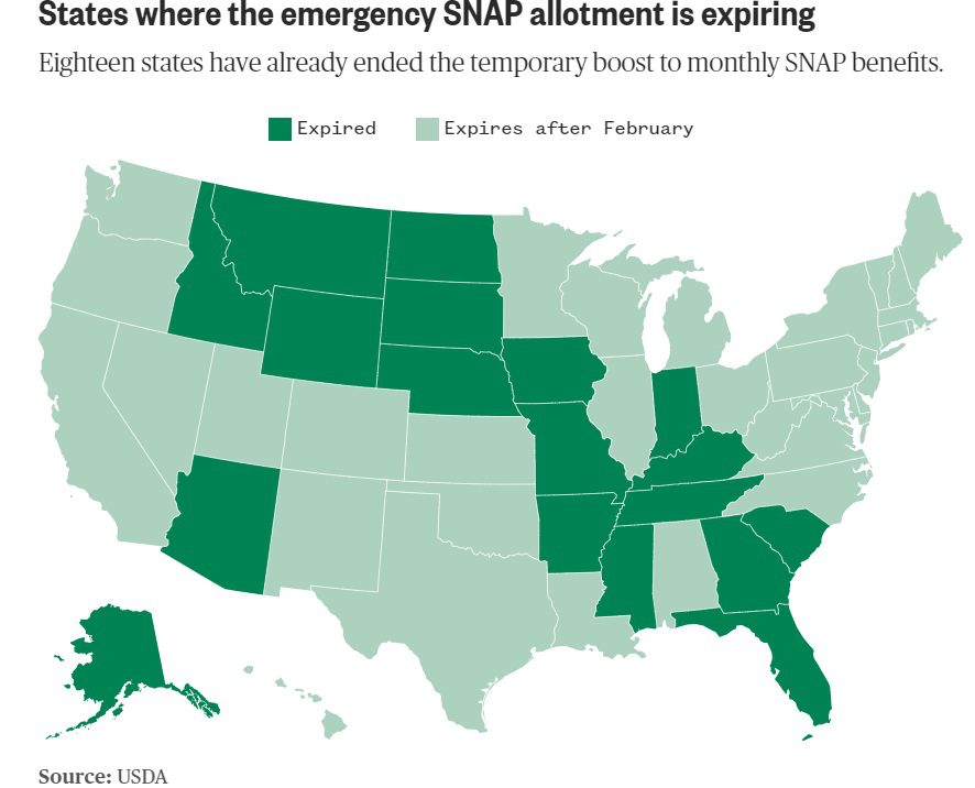 Eighteen states have already halted the additional allotments. At the end of February, the remaining 32 states and Washington, D.C., will follow, putting a financial strain on people already struggling to make ends meet.