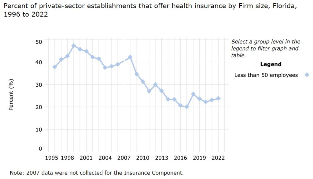 • Small businesses, which often don’t offer health insurance for employees, make up the majority of the workforce in Miami-Dade’s service-driven economy, including in areas where Obamacare is most popular. About 77% of Miami-Dade’s more than 260,000 businesses have fewer than 4 employees, according to the Miami-Dade Beacon Council. Only about a quarter of small businesses in Florida offer some form of health insurance, according to a 2022 survey by the agency for Healthcare Research and Quality, which is part of the U.S. Department of Health and Human Services.