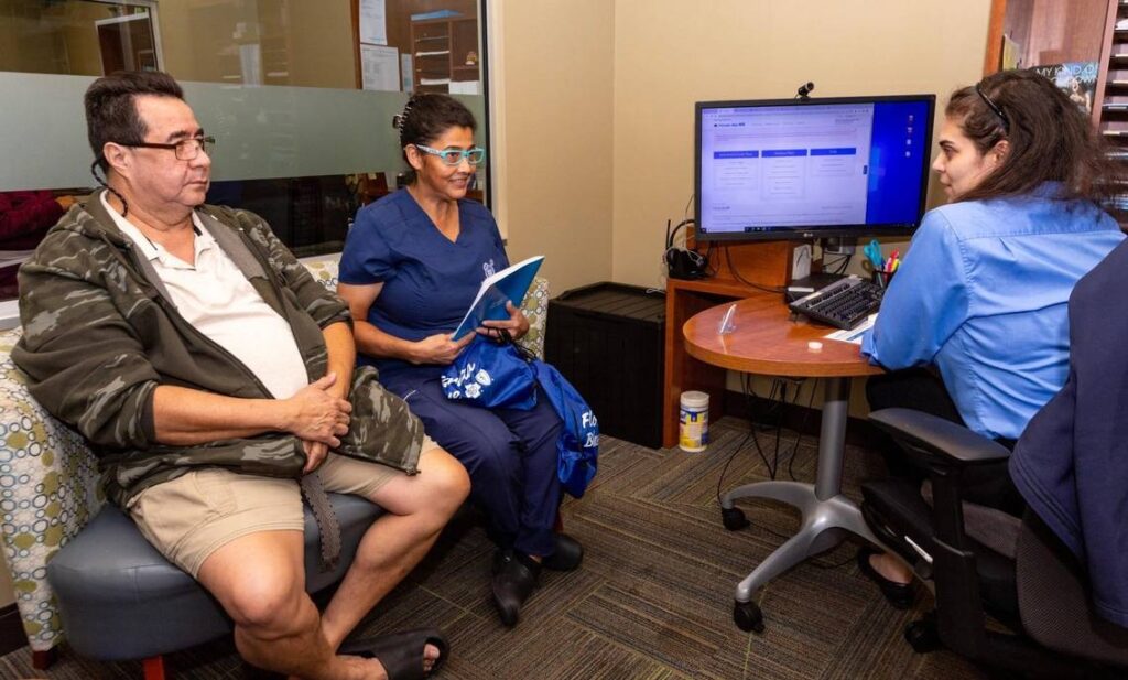 Obamacare enrollees Franklin Orozco, 58, left, Maria Pavon, 55, right, speak with Sales Consultant Melissa Cignarella, far right, at a Florida Blue Center in Hialeah, Florida, on Wednesday, December 20, 2023. D.A. Varela [email protected]