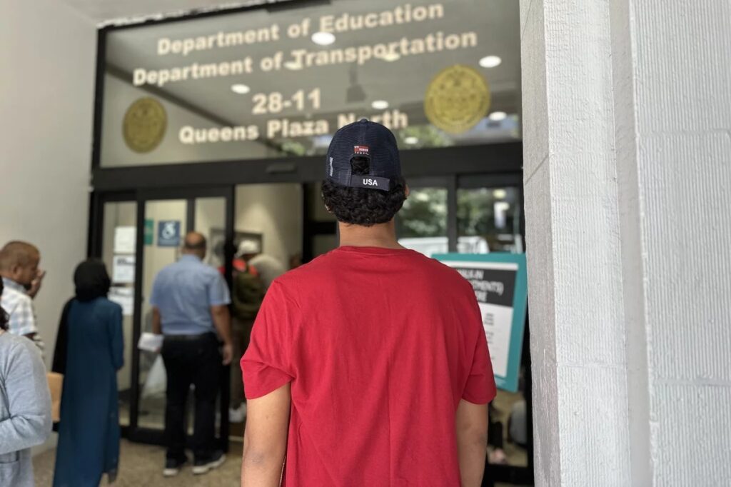 For all the excitement, some families also told NPR they are apprehensive. On a sweltering morning in September, immigrant families are lined up outside the Department of Education offices in Queens. They’re trying to find out where to send their kids. Jorge Delgado Vega arrived to New York just three days ago, from Ecuador. One of the first things the family did, was enroll Delgado in high school. He’ll be starting 11th grade in the next few days. “I feel very happy,” says Delgado. “It’s a new opportunity.” But he says he’s also nervous. He doesn’t know what school he’ll be going to yet, and hopes it’s a bilingual one. “I still don’t know English very well. I don’t know know how people will react. This makes me nervous.”