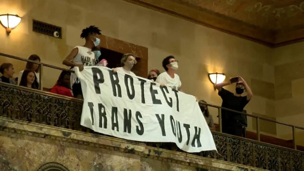 Officers removed protesters holding up a sign that read, “Protect Trans Youth,” from the Louisiana State Capitol in July 2021 as lawmakers considered anti-trans legislation. Photo courtesy of WAFB-TV