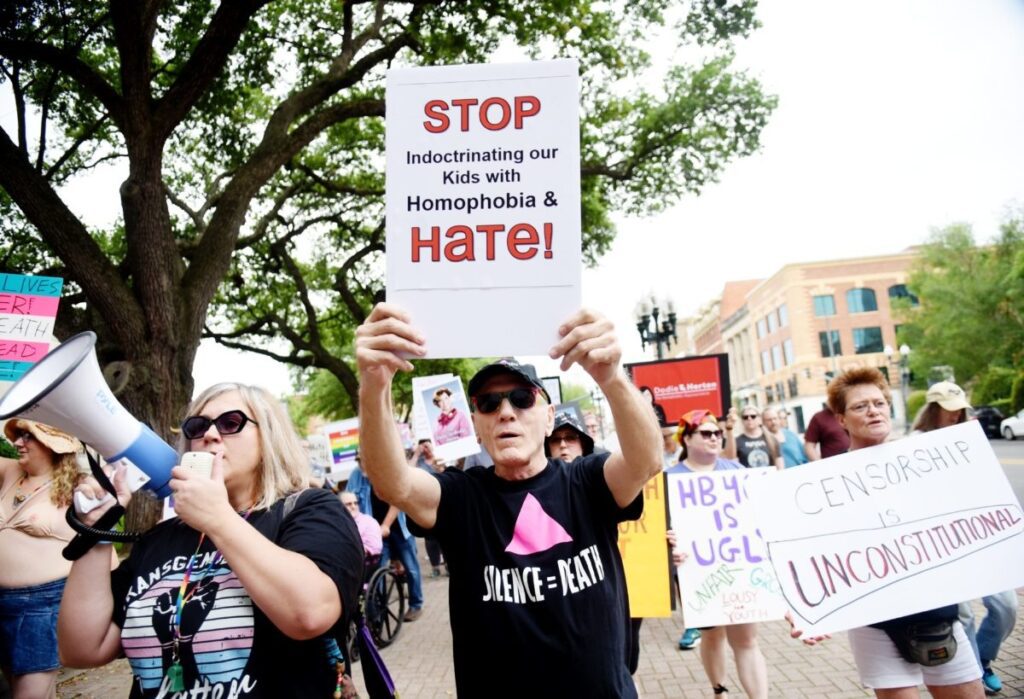 Demonstrators gather outside a Shreveport, Louisiana, courthouse in May to protest several anti-LGBTQ+ bills being considered by state lawmakers. Photo by Henrietta Wildsmith/The Times/USA Today Network