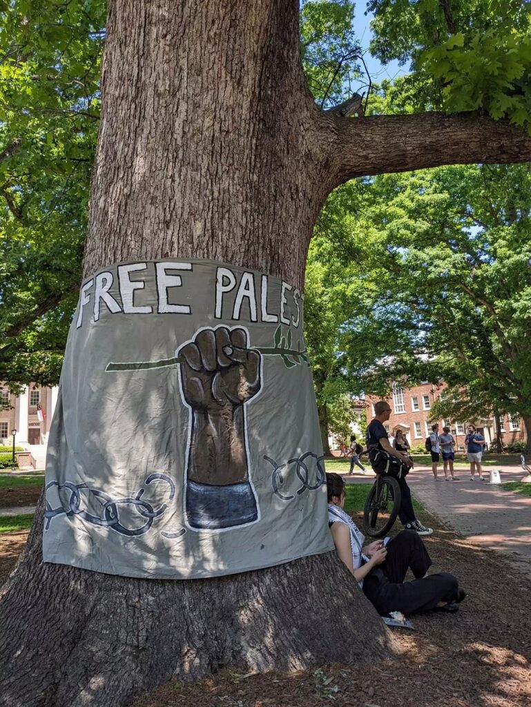 University administrators say the tents on Polk Place outside the Wilson Library violate a university policy that prohibits temporary structures on lawns beneath trees. Students for Justice in Palestine say the policy originated in the 1980s as a means to stem student protests against South African apartheid.