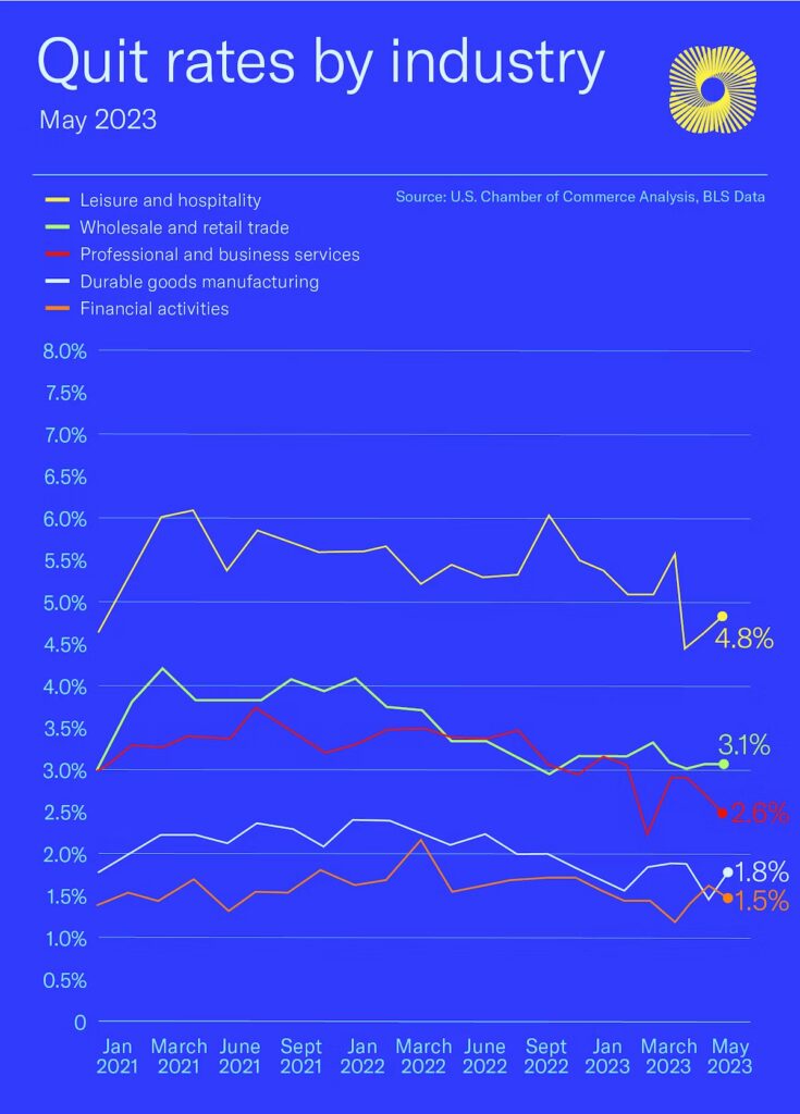 Meanwhile, in more stable, higher paying industries, the number of employees quitting has been lower.