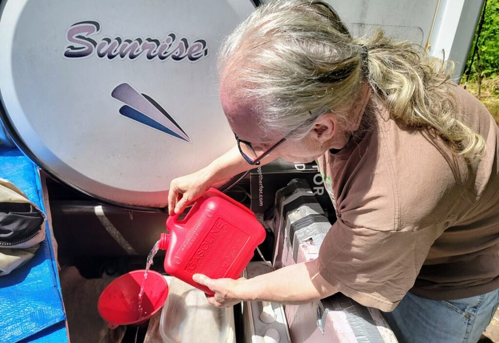 It’s hot and sunny around Seattle, and Keith Roberts needs to get the AC in his RV running. To do that he first has to fill up a generator that sits behind the 30-foot long motorhome. The generator is a big one and holds over five gallons of gas.