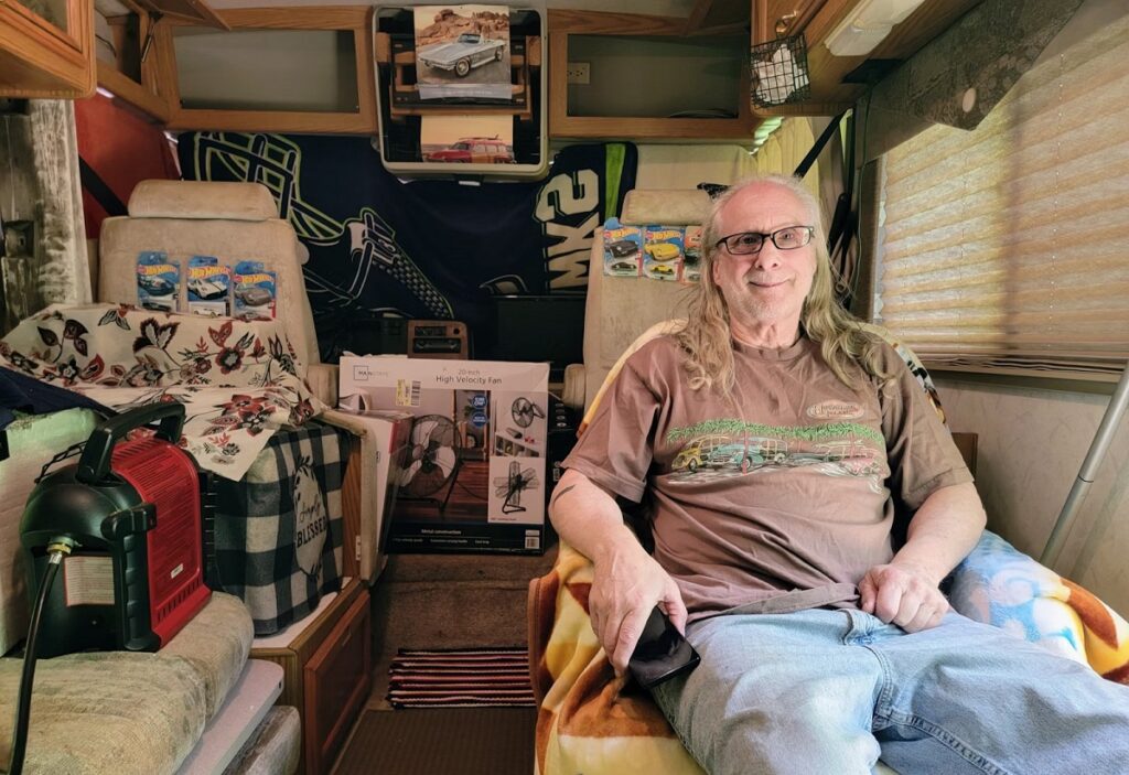 “That’s what I want to do. I don’t want I don’t want a house — I’m 68 years old, you know? I don’t want to live in an apartment, I don’t want to live with no roommates. I just want to be myself, you know, and so if I can find a place to park this,” he says tapping the side of his RV, “I’d be glad to.”