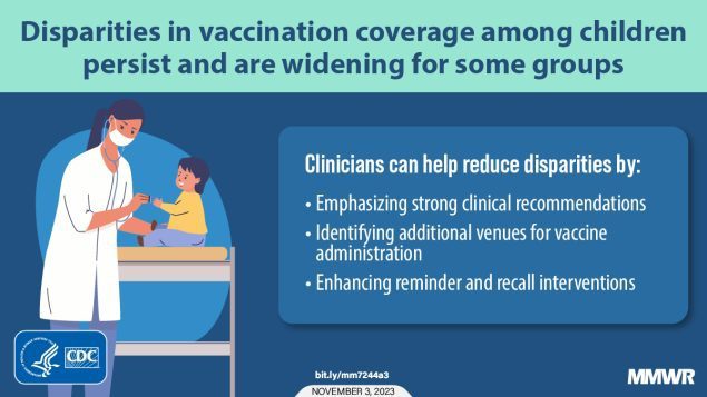 Disparities persist in vaccination coverage by race and ethnicity, poverty status, MSA status, and health insurance status and are often substantial. Lower coverage with the full series of Hib among AI/AN children compared with White children is particularly concerning given the sharply elevated incidence of Hib disease in the AI/AN population.¶¶¶¶ The largest observed coverage disparities were for ≥2 doses of influenza; influenza vaccination coverage varied widely by jurisdiction as well, with a range of 52.9 percentage points across the United States. Analysis of 5-year trends revealed that only a small proportion of the disparities involving sociodemographic variables changed over time, although it appears that children living below the poverty level might be losing ground compared with children with higher family incomes. Disparities such as these have been documented previously (3,4). Concern over financial barriers to vaccination led to the creation of the Vaccines for Children (VFC) program,***** which covers the cost of recommended vaccines for eligible children. The program appeared successful in reducing racial and ethnic disparities in coverage (5), but additional efforts will be needed to close the remaining coverage gaps. CDC is currently working with partners, such as state Medicaid programs, the Indian Health Service, and the Association of Immunization Managers, to increase awareness of the VFC program (6).