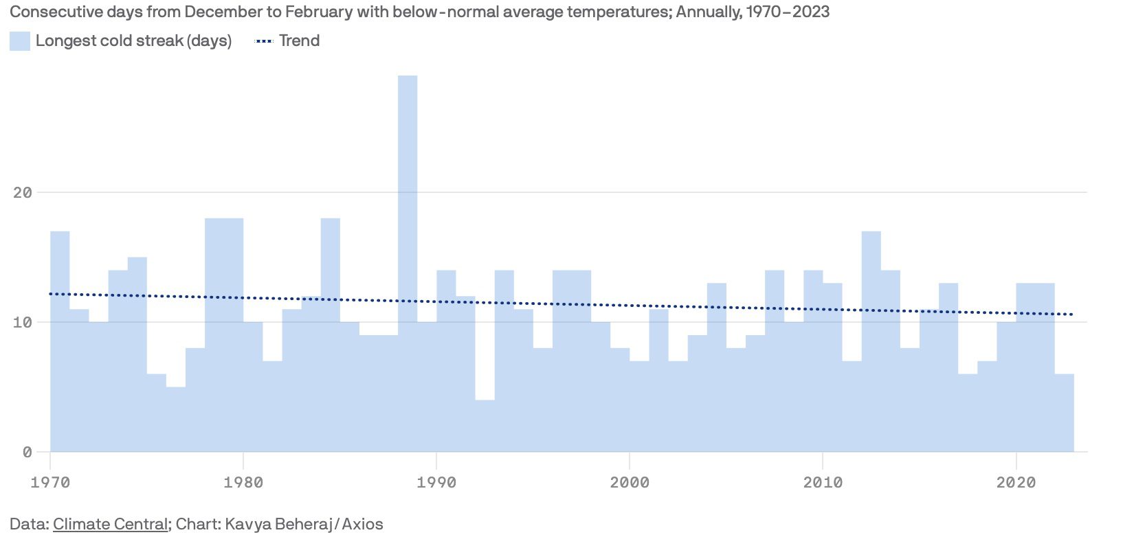 • “Winter’s longest cold streaks have gotten shorter since 1970 in 98% of 240 U.S. locations analyzed,” per Climate Central’s report.