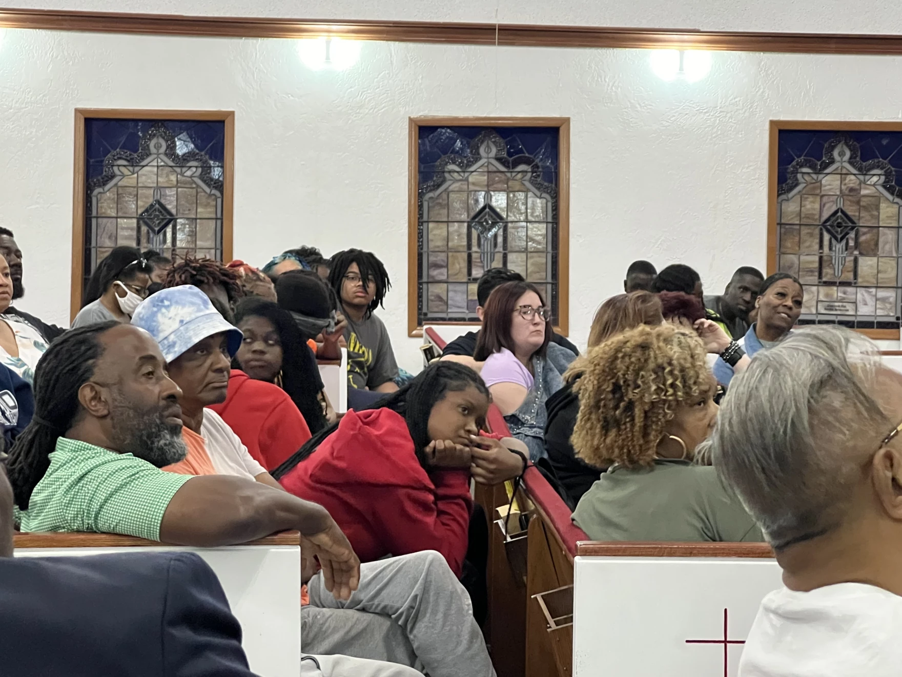 Dallas residents listen to community comments at New Morning Star Missionary Baptist Church Tuesday, April 16, 2024. The community meeting organized by Dallas ISD Trustee Maxie Johnson came days after one student shot and injured another at Wilmer-Hutchins High School April 12.