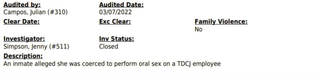 A spokeswoman for TDCJ said it refutes the idea that the grievance system doesn’t work. She added that there are multiple other avenues for an inmate to file a complaint, including through the independent ombudsman and the Prison Rape Elimination Act Officer.