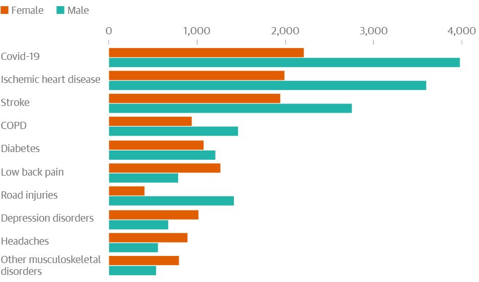 The analysis estimates that for 13 out of the top 20 causes of illness and death, including Covid-19, road injuries, and a range of heart, respiratory and liver diseases, the rate was higher in men than women in 2021.