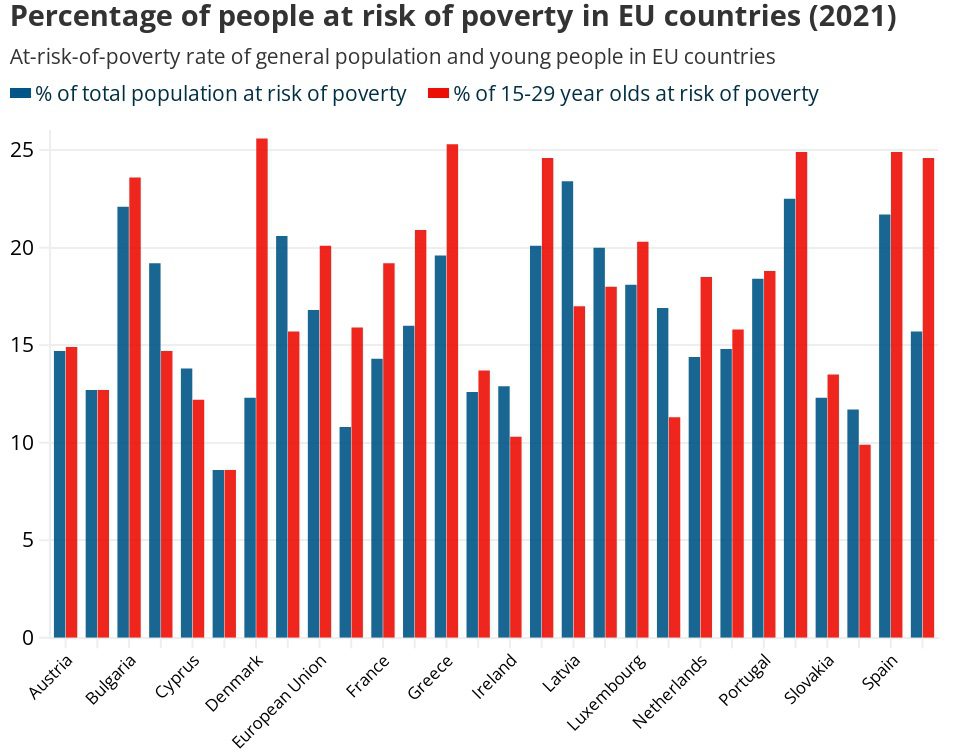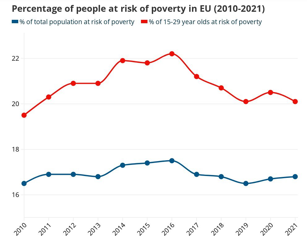 Their latest figures show that 20% of young people aged 15-29 were at risk of poverty in 2021, while the at-risk-of-poverty rate for the total population of the EU stood at 17%.